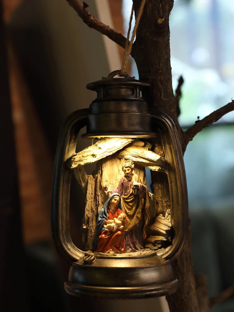 Il presepe di il bambino Gesù era riflessa nella lanterna appesa sul pilastro.
