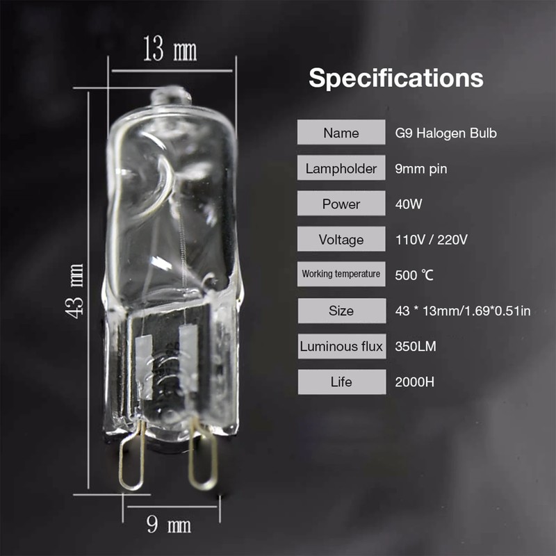 1 、 Specifiche di prodotto: Il forno potere della luce è 40W, la tensione di ingresso è 110V/220V, la temperatura di colore è 2600K e la luminosità 350LM.