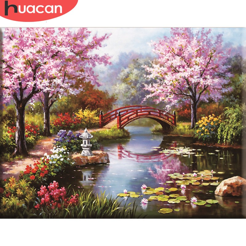 Huacan Punto Croce Ricamo Ponte Scenario Ricamo Imposta Albero Paesaggio Kit Tela Bianca Fai Da Te Home Decor 14Ct 40X50Cm