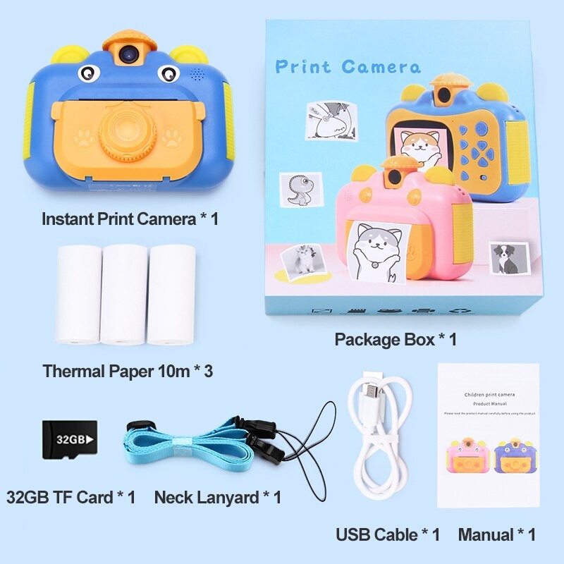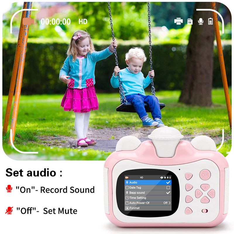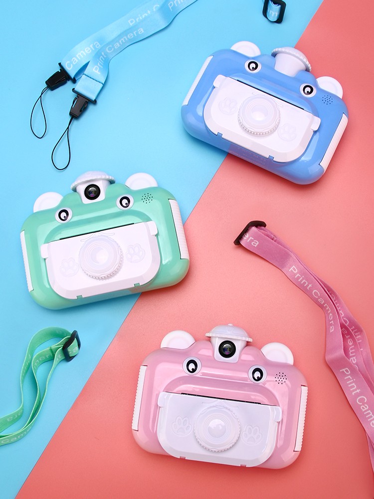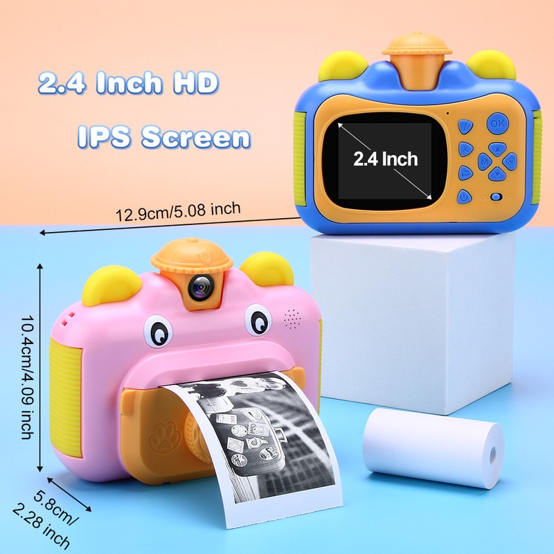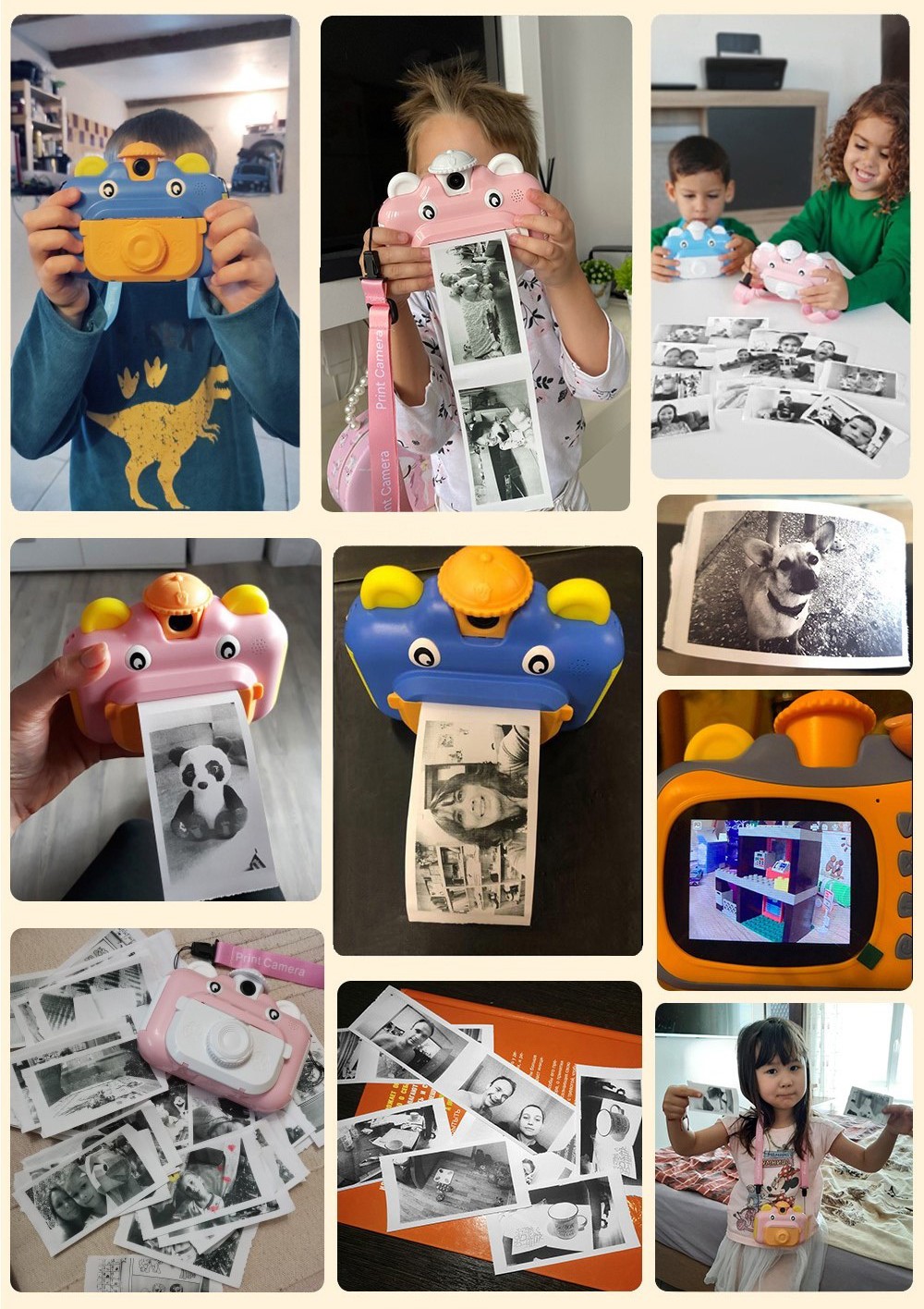 Il bambino della macchina fotografica ha funzioni di scattare foto, la registrazione video 1080p, e la stampa di foto immediatamente. 3 in 1 progettato fotocamera è più conveniente per i bambini per registrare i loro momenti meravigliosi.