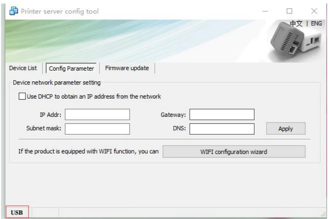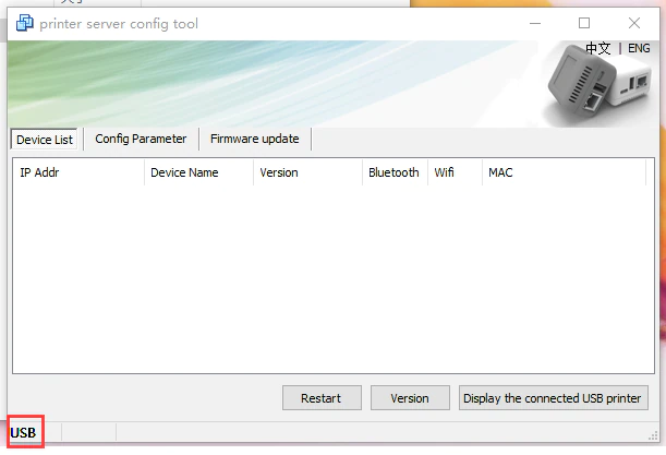 Ci vogliono circa 20 secondi, poi il server di stampa strumento di configurazione sarà USB display segno nell'angolo in basso a sinistra, che indica che lo strumento di configurazione è stato identificato il server di stampa come Immagine 1 mostra: