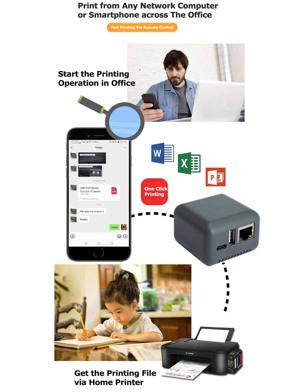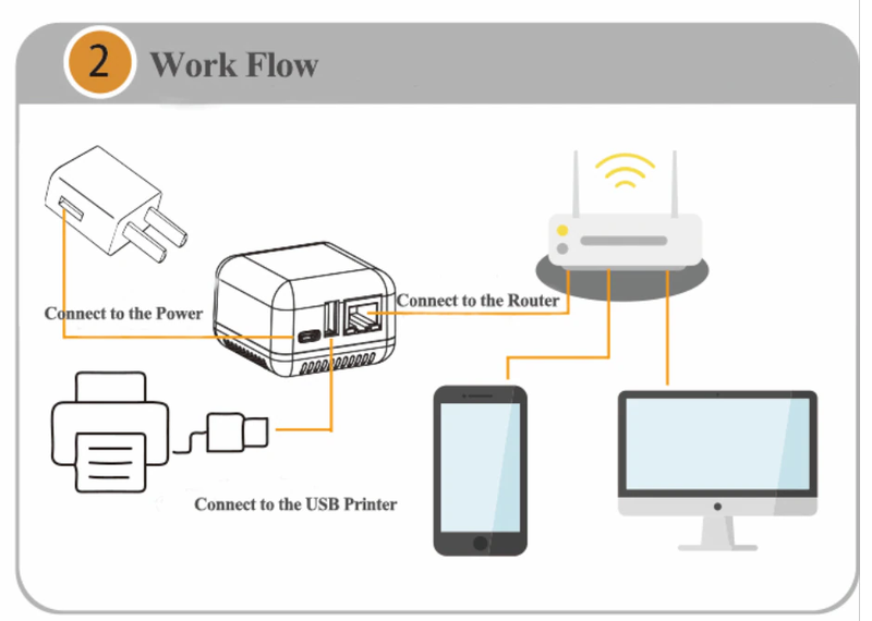 3.Cross-Rete di Stampa: Fino a quando il server di stampa USB è connesso a Internet, l'altro collegato telefoni cellulari o computer in grado di stampare direttamente i file.