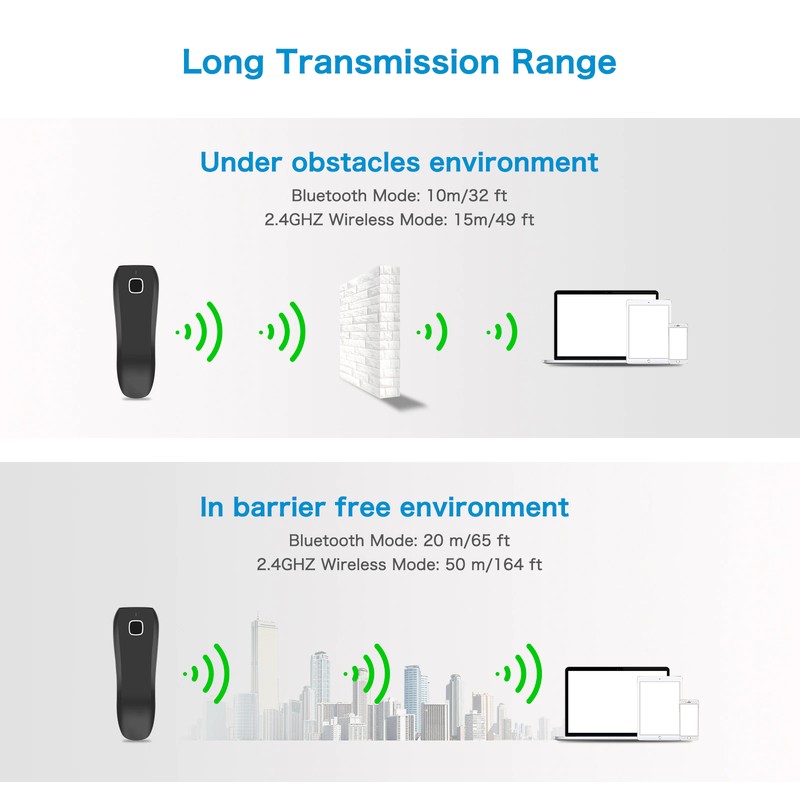 Collegare lo scanner al vostro iOS/dispositivo Android con facilità e godere di codici a barre di scansione in modalità wireless fino a 30 piedi di distanza.
