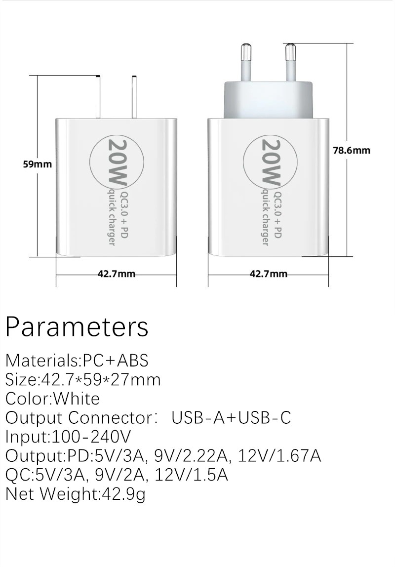 Numero di modello: QC 3.0 20W PD EU USA Caricabatterie da parete veloce per Apple