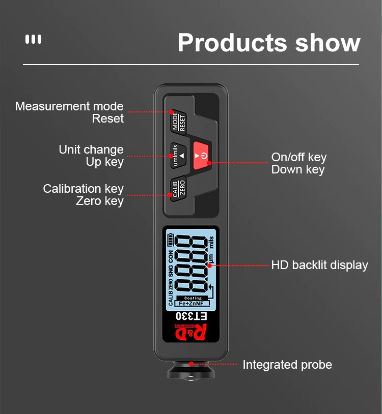 Il calibro è progettato per misurare in modo non distruttivo lo spessore del rivestimento e della pittura. È essenziale per il trattamento delle superfici dei materiali e ampiamente utilizzato nell'industria manifatturiera, nell'industria della lavorazione dei metalli, nell'industria chimica, nell'area di ispezione delle materie prime e anche in grado di lavorare costantemente in laboratorio, in officina e all'aperto.