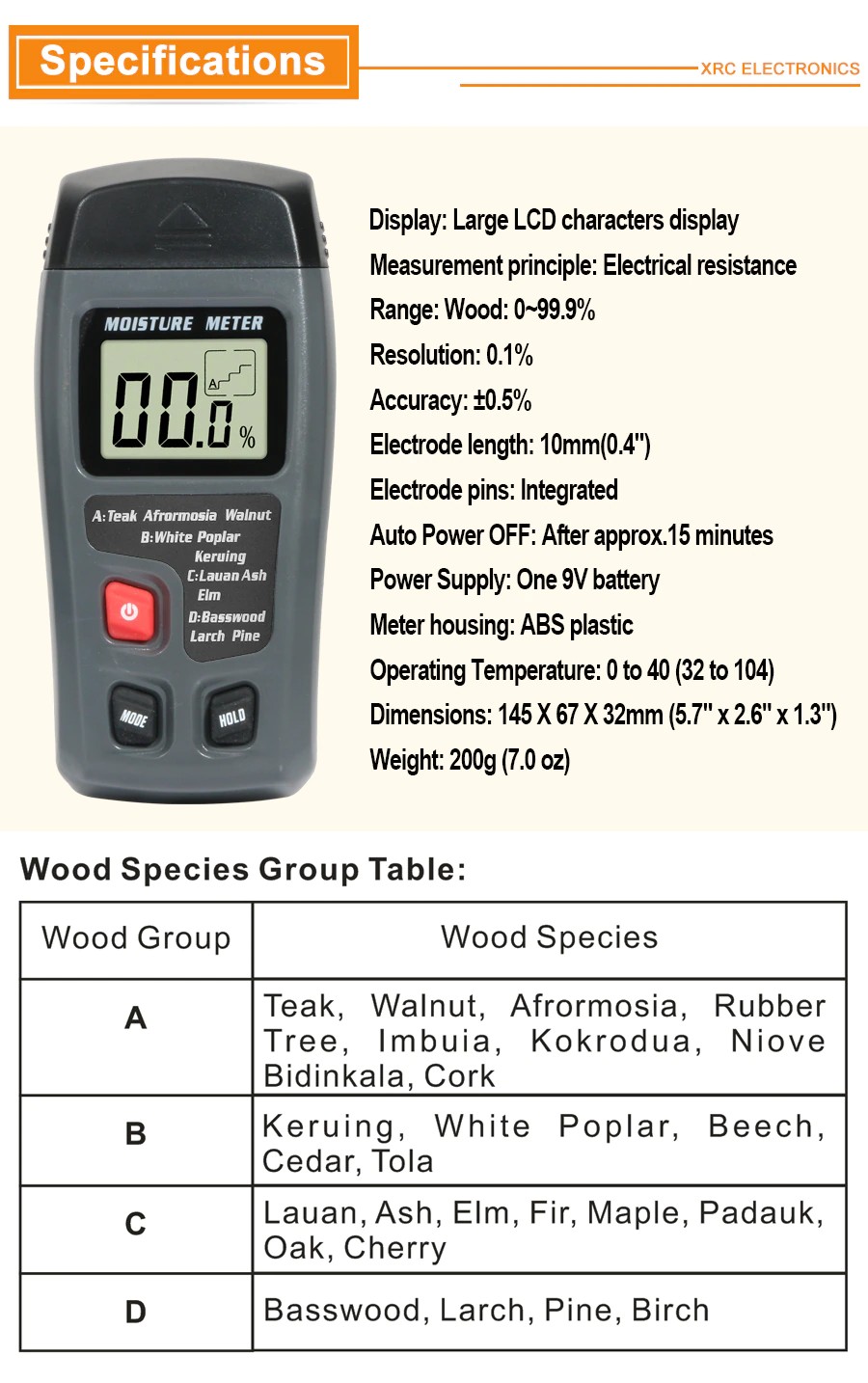 Ampio campo di Misura 0 ~ 99.9%, adatto per 4 Gruppo di Specie di Legno