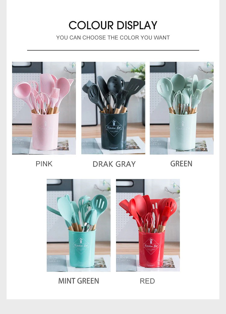 Silicone Utensile Set è assistente Della Cucina, perfetto per tutti i tipi di alimenti e la cucina e cucina accessaries, stir fry, mescolando crema, burro, gelato, ecc. Include spatola, pennello per condimenti, a spatola, round-bordo turner, mestolo, straight-edge turner, Cucchiaio, pinze, Pasta forchetta e perfetto per tutti i tipi di alimenti e di cottura.