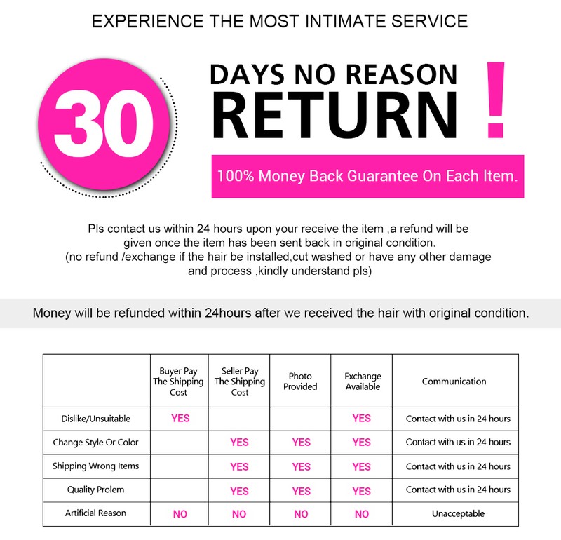 Pls in contatto con noi entro 24 ore dopo il vostro ricevere l' articolo, sarà dato un rimborso una volta che l' articolo è stato inviato indietro nello stato originale. (Nessun rimborso/scambio se i capelli essere installato, taglio lavato o avere qualsiasi altro danno e di processo, capire gentilmente pls)