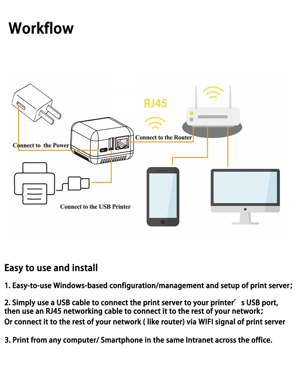 7.Quick & Easy Stampa: Fino a quando il server di stampa USB è connesso a Internet, l'altro collegato telefoni cellulari o computer in grado di stampare direttamente i file.