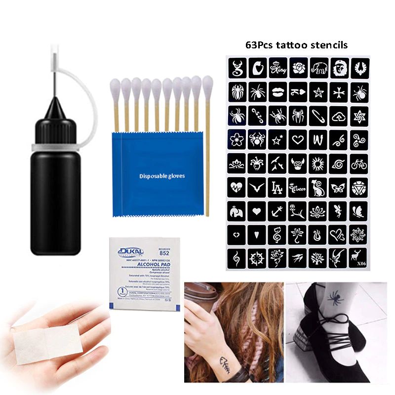 1セット = 1タトゥーペンシル,黒インク,10ml,63本,綿棒10本,使い捨て手袋1組,ワイプ1本
