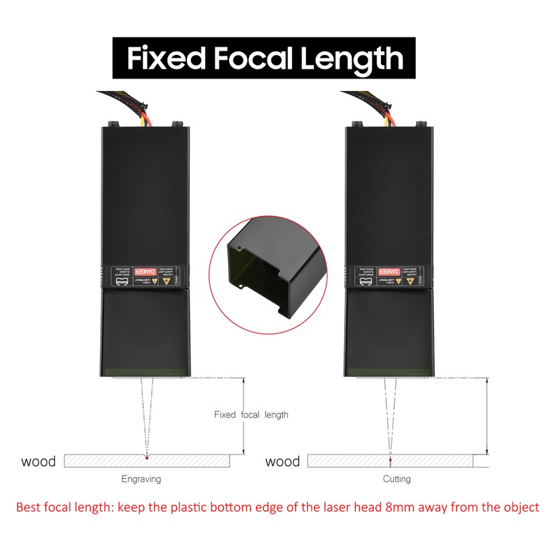 それは、固定焦点距離 (最高焦点距離: プラスチック底のエッジレーザーヘッド8ミリメートルから彫刻オブジェクト)。 優れた耐久性を備えたプレミアム品質のアルミニウム合金ハウジングで作られています。