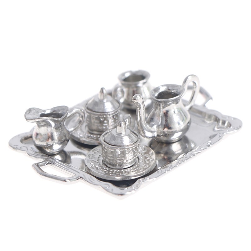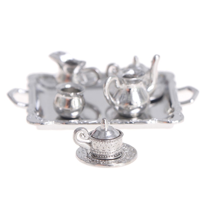 10個1/12ドールハウスミニチュアsilver金属茶コーヒートレイ食器セット