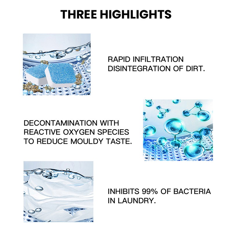 5.特別に配合されたタブレットはゆっくりと溶解し、洗濯サイクル全体にわたって持続し、残留物を漂白剤よりもよく分解します。;
