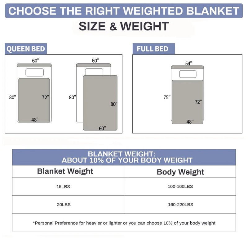 加重毛布は、体重の約8〜12% にすることを目的としています。以下のサイズ表に従って、理想的な毛布のサイズを選択してください