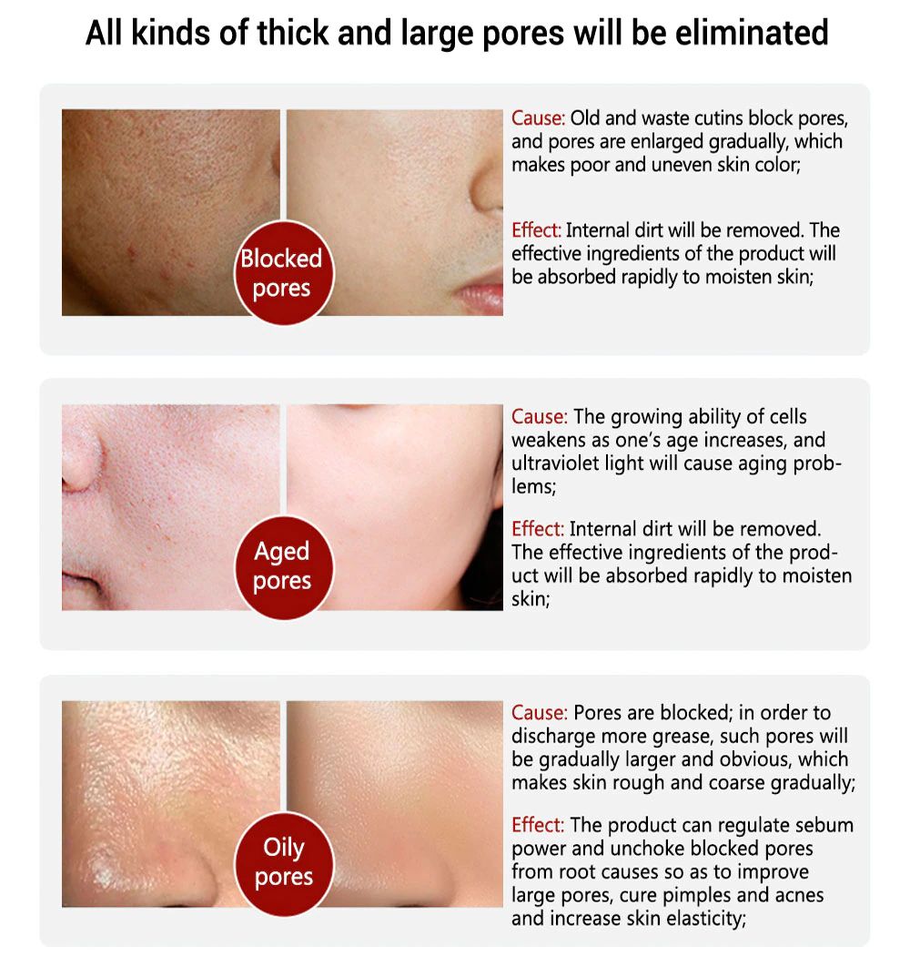詰まった毛穴 原因: 古いカチンと廃棄物のカチンが毛穴をブロックし、 毛穴が徐々に拡大し、 肌の色が悪く、不均一になります。 効果: 内部の汚れが除去されます。 製品の有効成分は 肌を湿らせるために急速に吸収されます。 老化した毛穴 原因: 年齢が上がると細胞の成長能力が弱まり、紫外線が老化の原因となります。 効果: 内部の汚れが除去されます。製品の有効成分は肌を湿らせるために急速に吸収されます。 油性毛穴 原因: 大きな毛穴を改善し、にきびやにきびを治し、肌の弾力性を高めるために、力を与え、詰まった毛穴を根元から取り除きます。