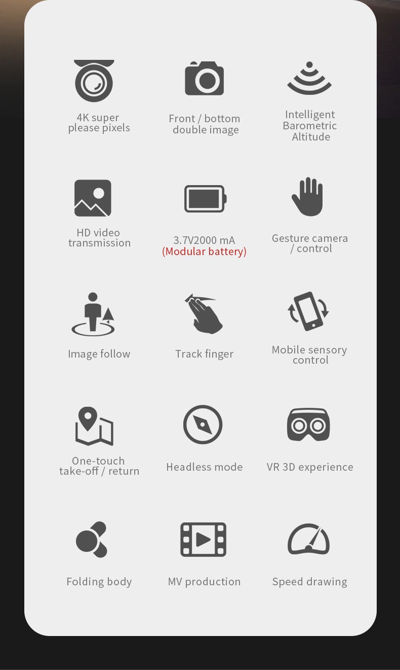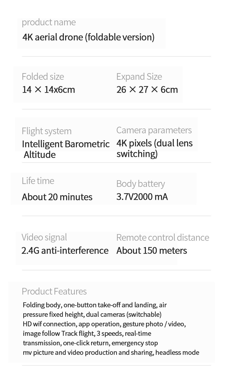 機能: 前後、上/下、左/右フライト、左/右ターン、ホバー、ワンボタンの離陸/着陸、ヘッドレスモード、高度維持、ワンボタンリターン、wifiコントロール写真/ビデオ
