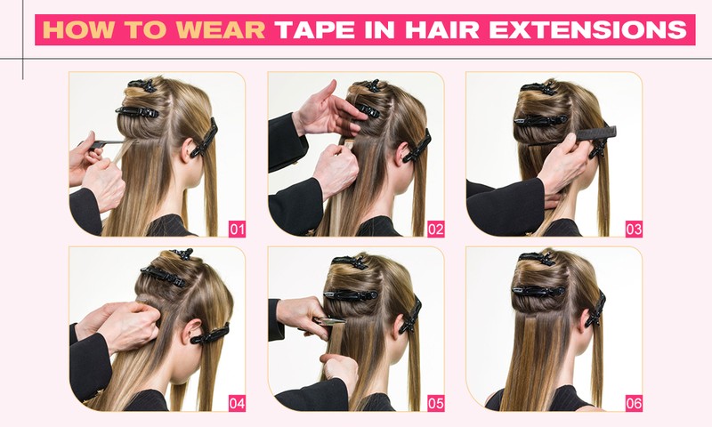 2.頭皮から1/4インチのところに分割されたヘアエクステンションの下に、1枚のヘアエクステンションをテープで留め、テープカバーをはがします。