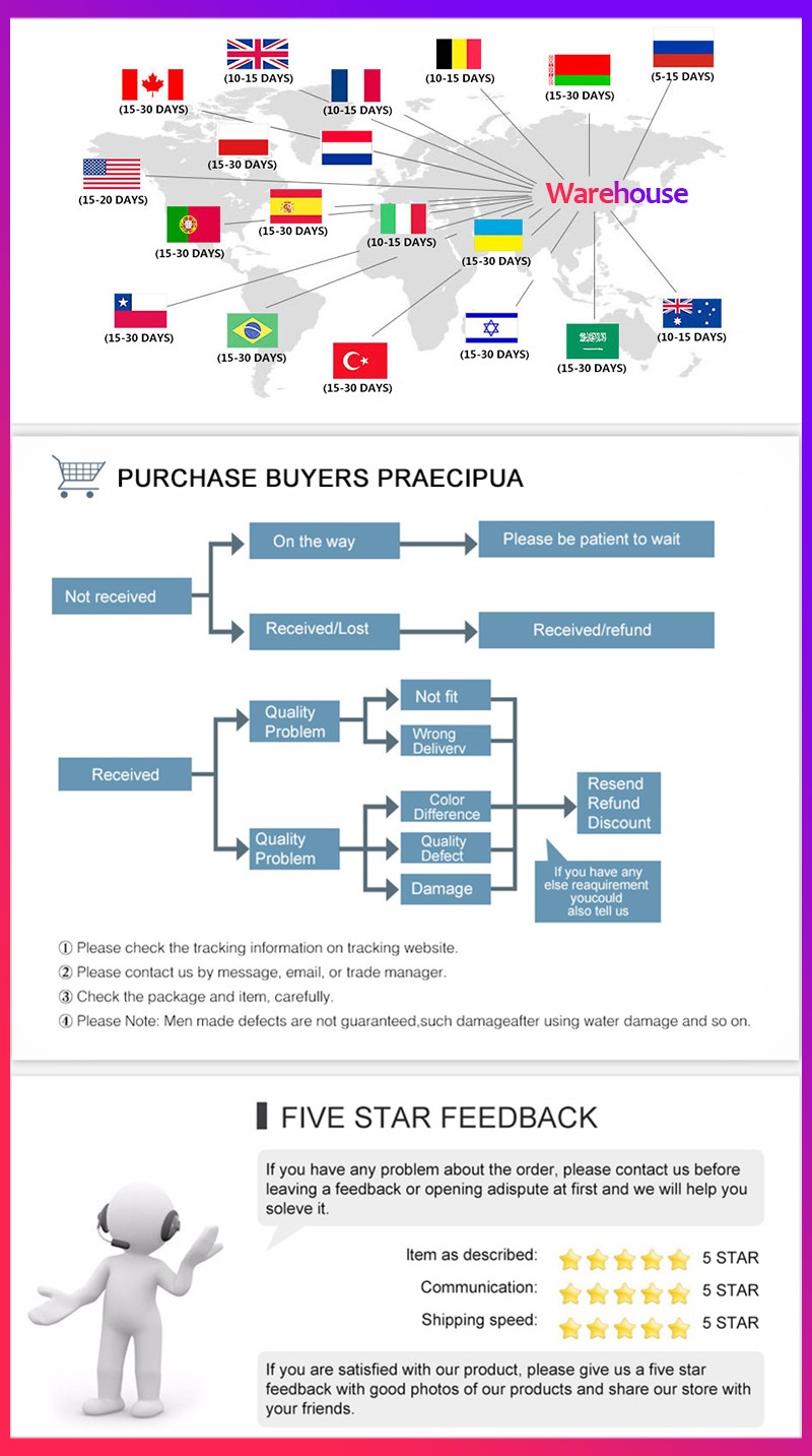 1。お支払い後、在庫状況と時差により、迅速な配送のために最初に利用可能な倉庫から商品を出荷することを選択します。約1日から5日以内に商品をご用意します。 一般的に、配達時間は約5-60日で、遠隔地または未開発国からの出荷の場合はさらに長くなります。