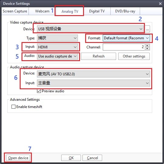 ACHIオーディオキャプチャデバイス「av to usb2.0」を選択