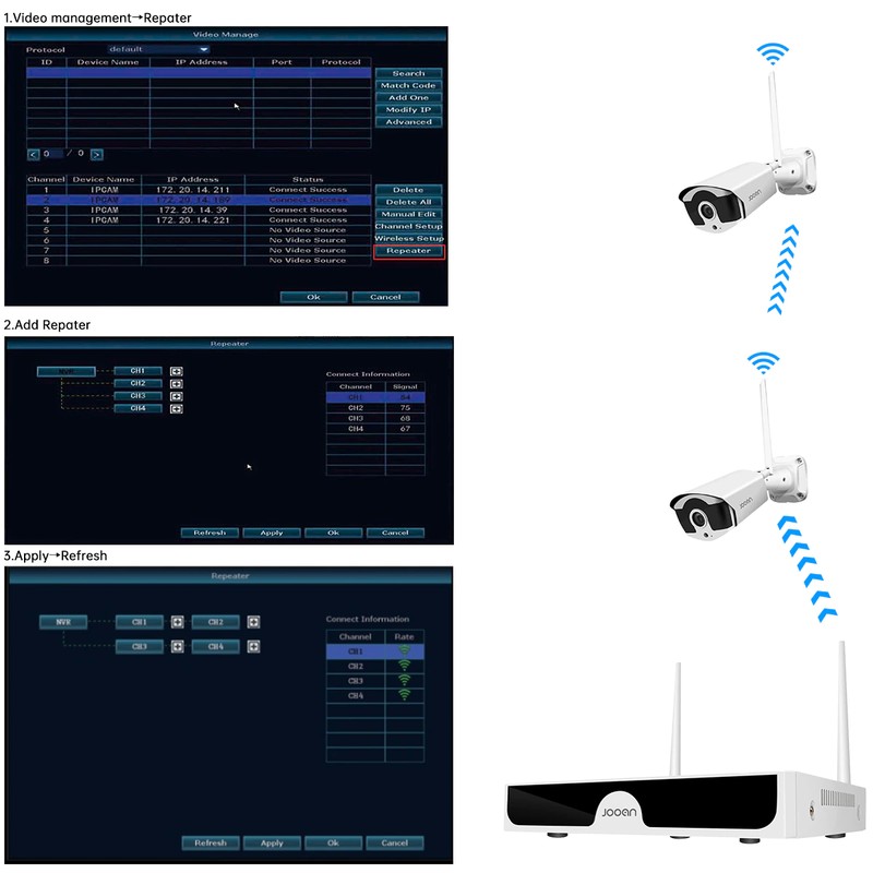4. Conexión WiFi inalámbrica entre NVR y cámaras IP;
