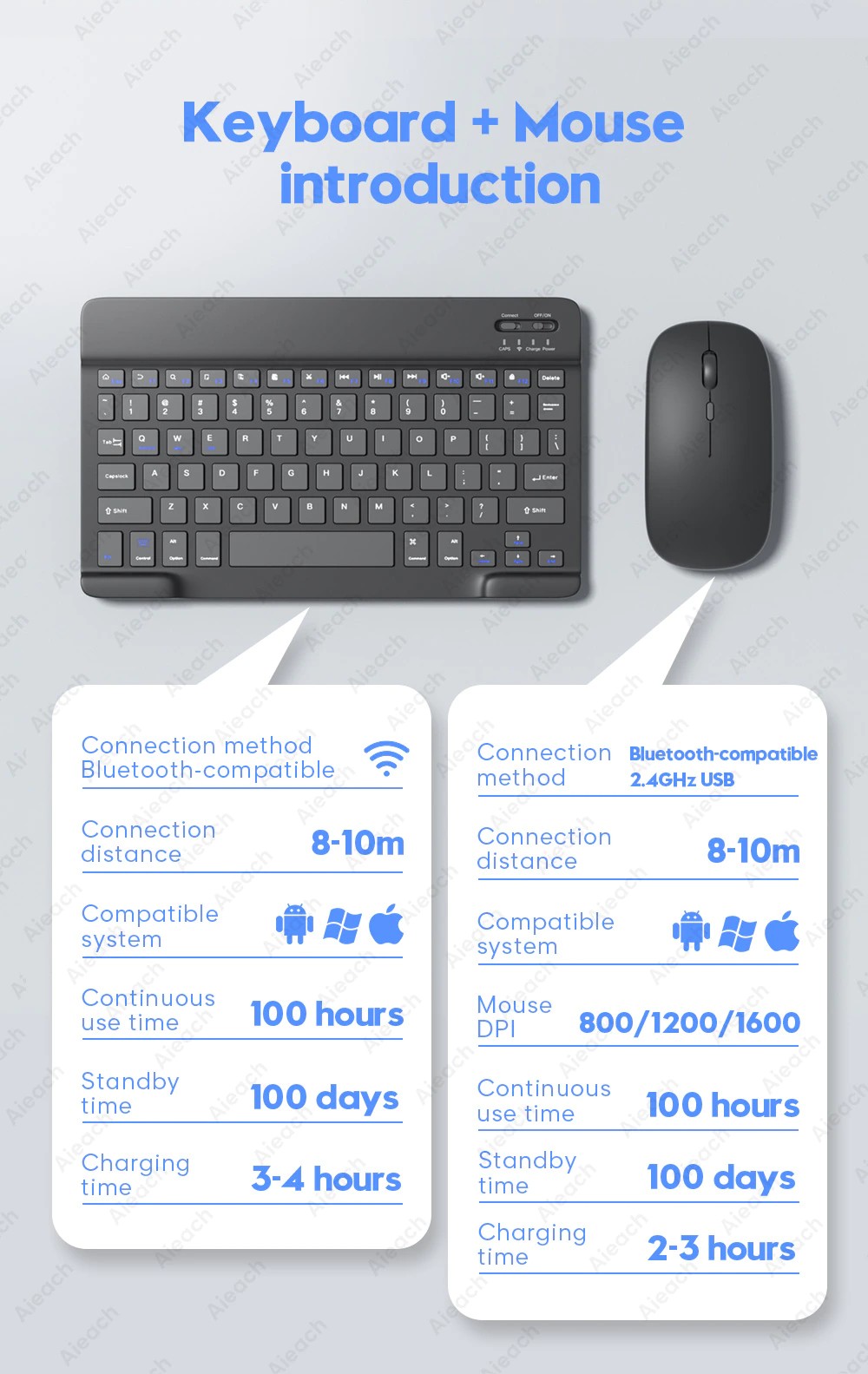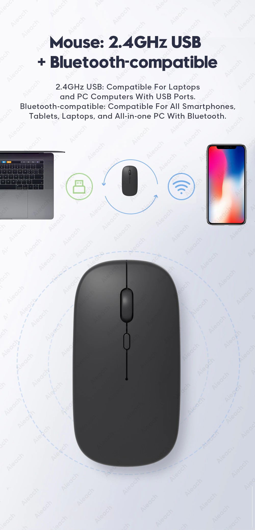 Bağlantı yöntemi: Bluetooth uyumlu/2.4GHz kablosuz USB Bağlantı mesafesi: 8m-10m Fare DPI: 800/1200/1600 Uyumlu sistem: IOS/Android/Microsoft Uygun için: smartphone/tablet/dizüstü/bilgisayar Akıllı uyku: kullanım yok, 3 dakika sonra uyku Sürekli kullanım süresi: 100 saat Bekleme süresi: 100 gün Şarj süresi: 2-3 saat