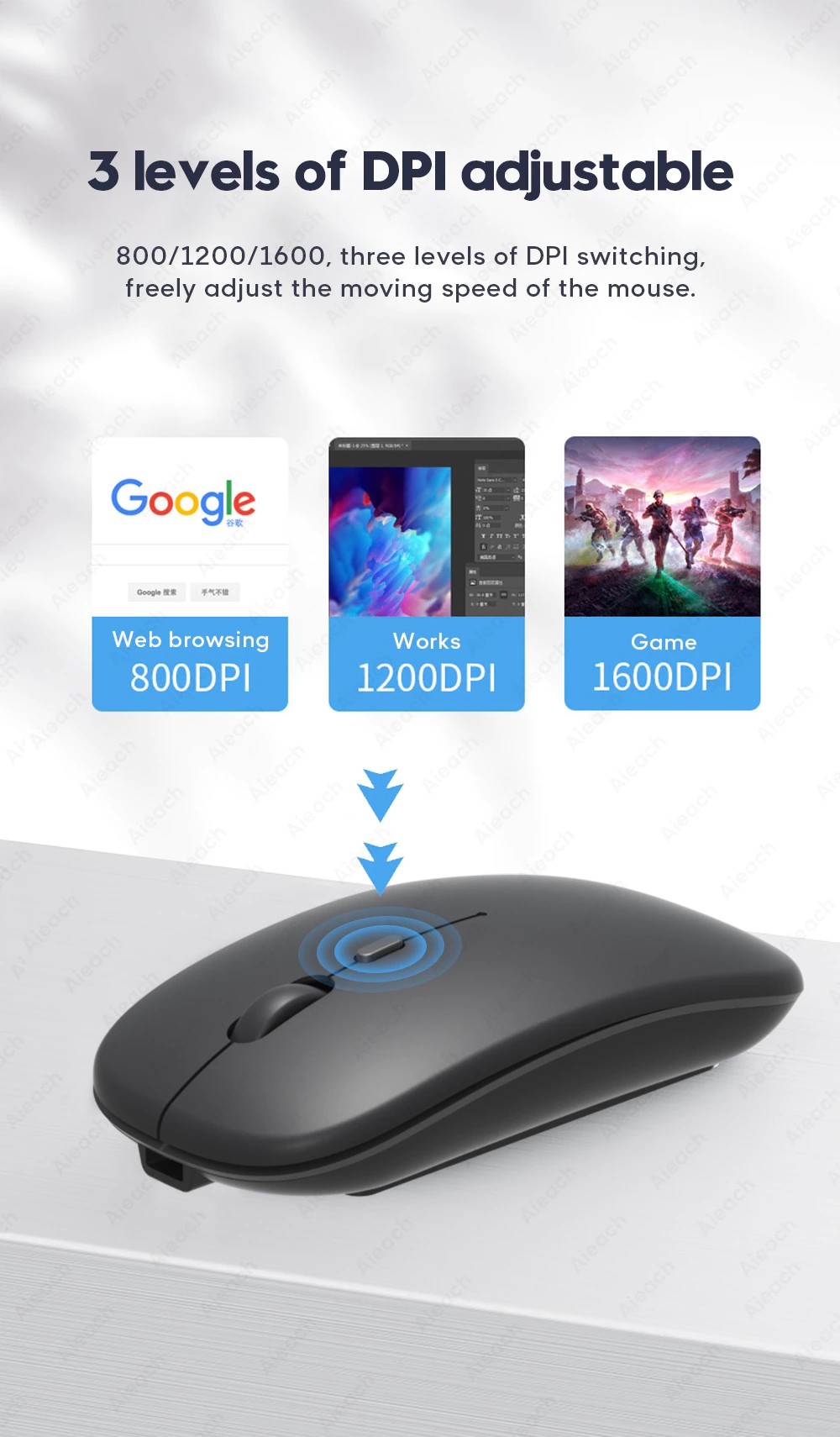 800/1200/1600, üç DPI anahtarlama seviyesi, Farenin hareket hızını serbestçe ayarlayın.