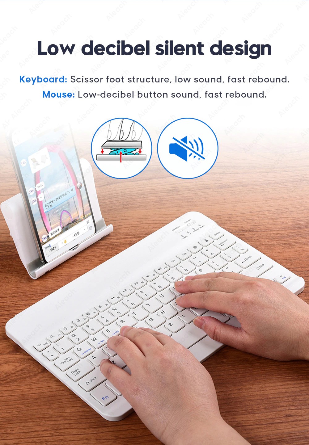 Klavye: makas ayak yapısı, düşük ses, hızlı geri tepme. Fare: düşük desibel düğmesi sesi, hızlı geri tepme. Düşük desibel düğme sesi, dışarı/ofis kullanımı için çok uygundur.