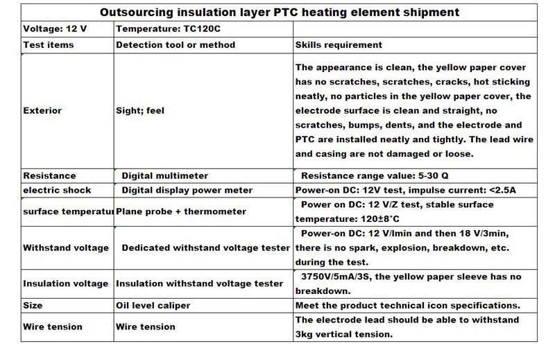 PTC 발열체는 직류 전기를 통한 외부 압력 판, 스테인리스 물결 모양 봄 조각, 직류 전기를 통한 안 압력 판, 단 하나 층 알루미늄 열 싱크, ptc 열 생성 조각으로 이루어져 있습니다, 이중층 알루미늄 방열판, 니켈 도금 구리 전극 단자 및 pps 고온 플라스틱 전극 덮개.