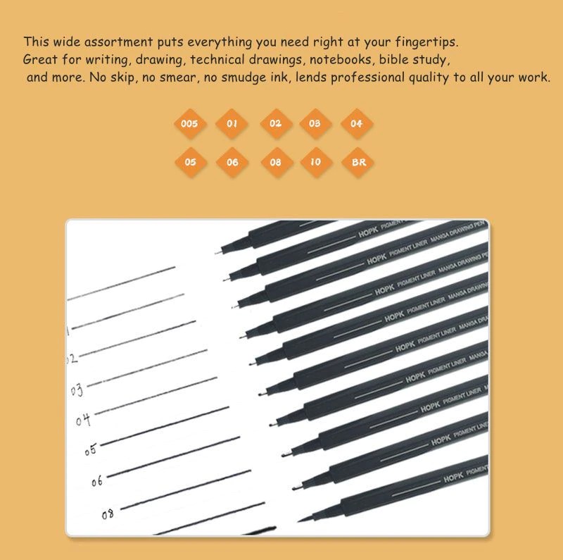 마이크론 펜은 그래픽 아트 작품, 스크랩북, 보관 기록, 일러스트, 프리 핸드 아트, 고무 스탬프, 만화 그림 및 직물 최적의 청소 결과를 위해 100% 면 직물에 적합합니다. HP 잉크는 염료 잉크 정립보다 복잡하고 안정적 일 수 있습니다. 튼튼한 잉크 chemicalproof 반대로 퇴색, 방수. 건조 할 때 얼룩 또는 깃털 없음. 대부분의 종이를 관통하지 않습니다. ASTM 및 ACMI nontoxicity 기준을 만납니다.