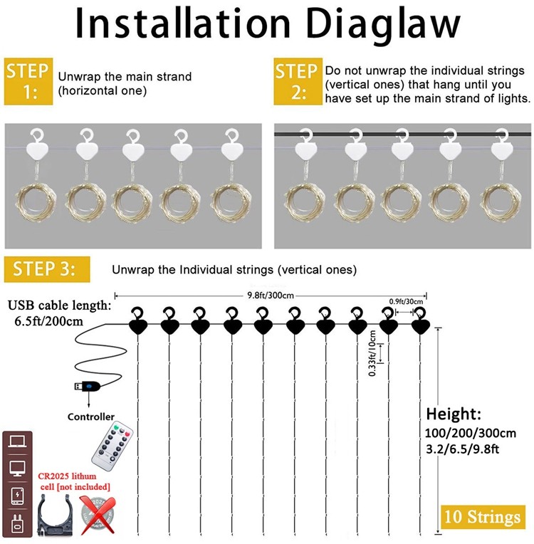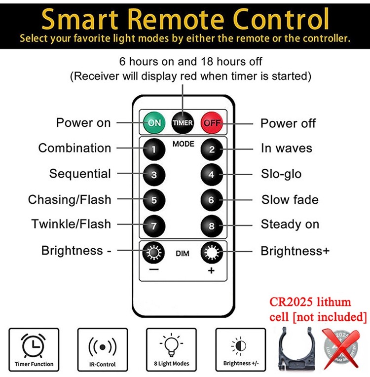USB 전원 및 원격 제어(원격 제어는 배터리를 작동해야하지만 제품은 CR2025 버튼 배터리를 포함하지 않습니다): 직접 플러그/전원 켜기/끄기 및 당신은 8 모드 설정을 조정하는 usb에 버튼을 누를 수 있습니다. 그리고 당신은 쉽게 리모컨을 통해 조명을 켜기/끄기, 타이머에서 자동으로 켜고 끄기, 밝기를 조정, 8 모드 설정을 조정할 수 있습니다.