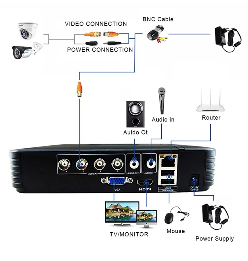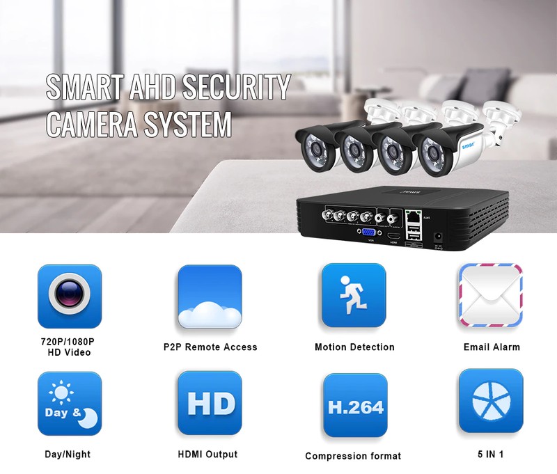 사용 자기 적응 기술 지원합니다 5 종류의 카메라 모드: 아날로그 AHD IP TVI 및 CVI. 완벽한 시스템을 연결하는 것은 매우 쉽습니다. 카메라 모드와 PAL/NTSC 형식을 전환 할 필요가 없습니다.
