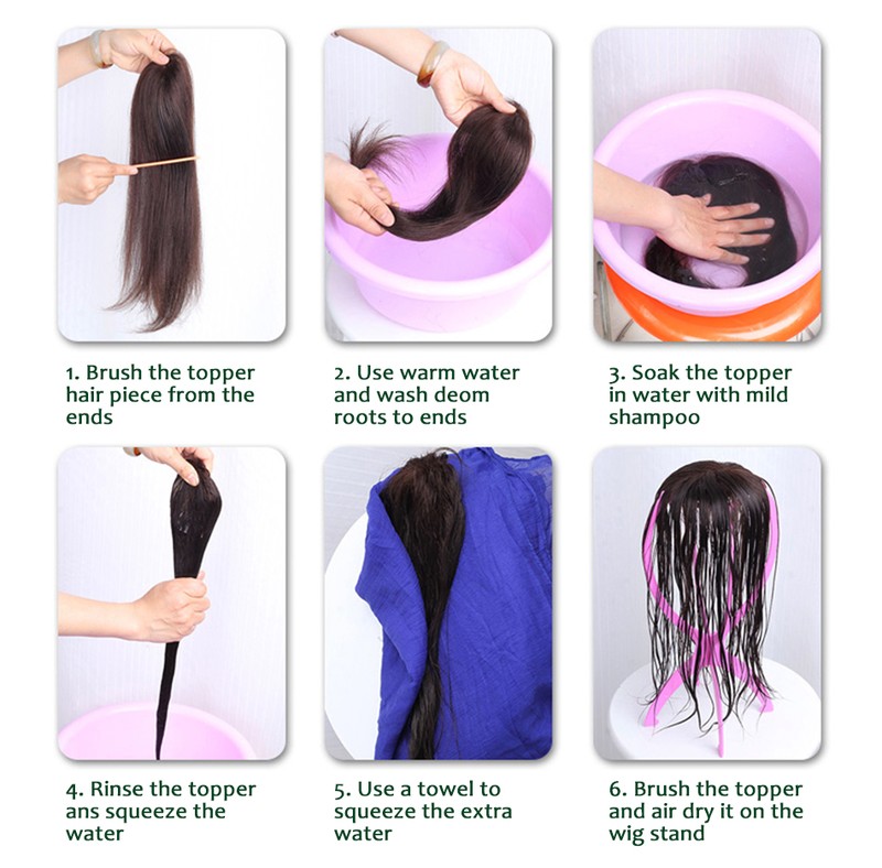 A: 머리를 씻는 것처럼 순한 샴푸를 사용하십시오. 주당 1 - 2 회 세탁을 제안합니다. (컨디셔너를 사용하지 마십시오. 테이프 영역을 세척하십시오.)