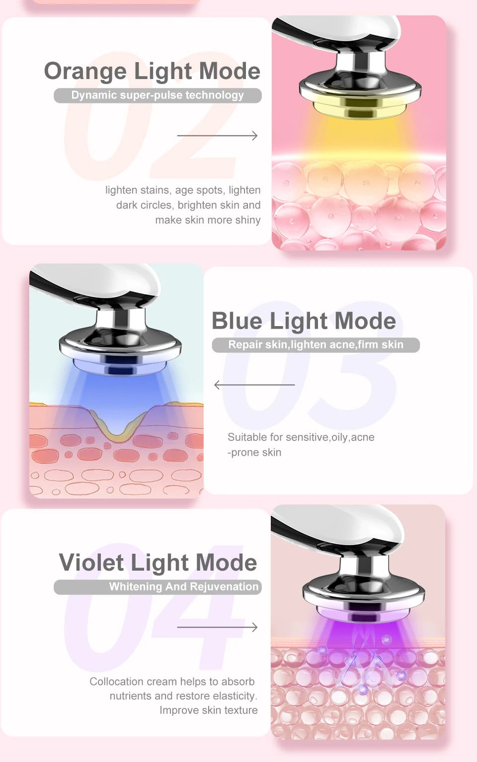 판매자 답변: 4 개의 조명, 붉은 빛이 손상된 피부를 수리하는 데 사용되며, 푸른 빛이 여드름, 진정 피부 및 항염증제를 밝게하는 데 사용됩니다. 주황색 빛은 피부를 밝게하고 염색을 감소시키기 위하여 이용되고, 색깔 빛은 피부를 희게하고 젊어지게 하기 위하여 이용됩니다.