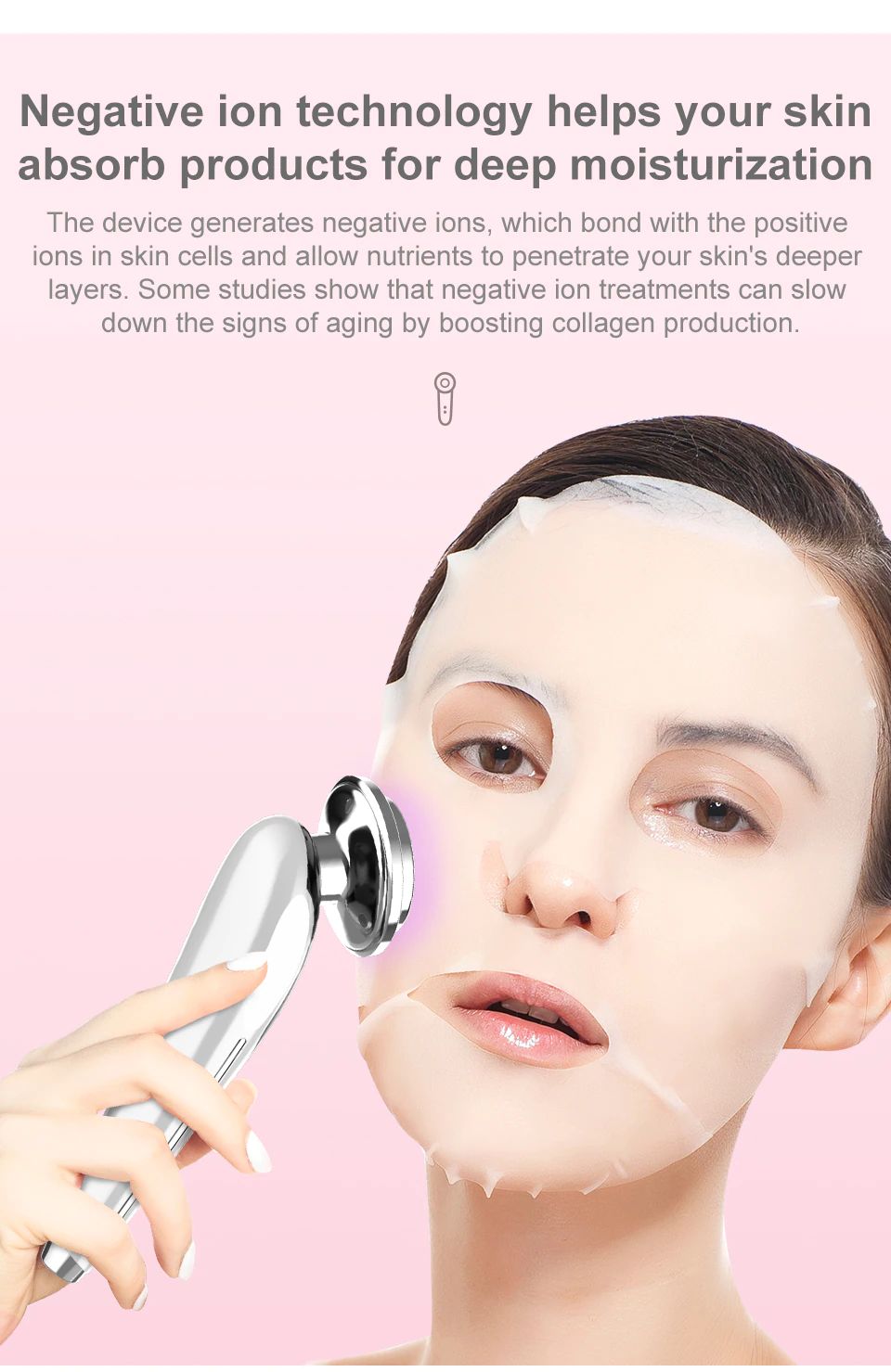 [긍정적이 고 부정적인 이온] 긍정적이 고 부정적인 이온 사이의 상호 매력의 원리를 사용 하 여 깊은 구멍에 있는 먼지는 생물학적 전류에 의해 씻어 완전히 청소. 화장용 성분은 iontophoresis를 통해 피부의 더 낮은 층에 관통합니다.