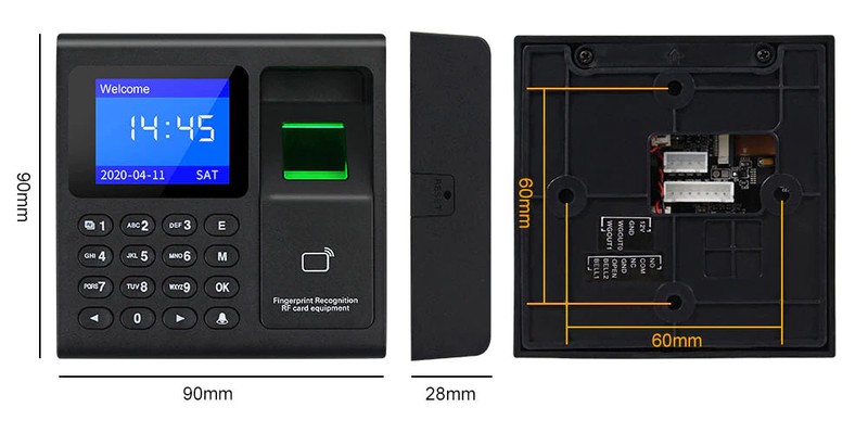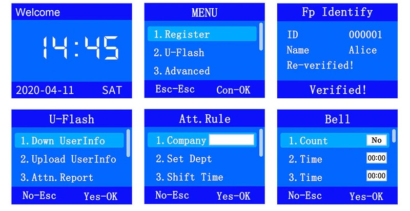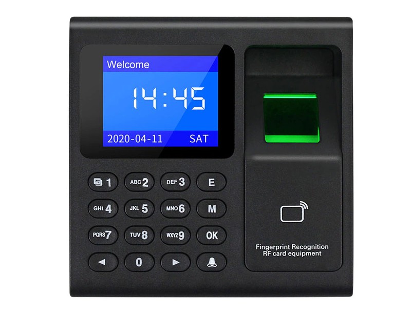 이 지문 타임 레코더를 사용하면 직원이 지문, RFID 카드 및 비밀번호로 체크인 할 수 있습니다. 지원 1000 사용자 용량, 1000 지문, 1000 암호, 1000pcs RFID 카드, 100000 시간 출석 기록 용량.