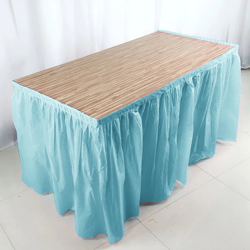 우리의 일회용 테이블 스커트는 폴리에틸렌으로 만들어졌으며 천으로 느껴지는 무광택 플라스틱입니다.