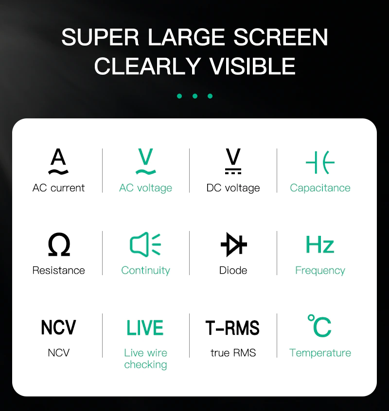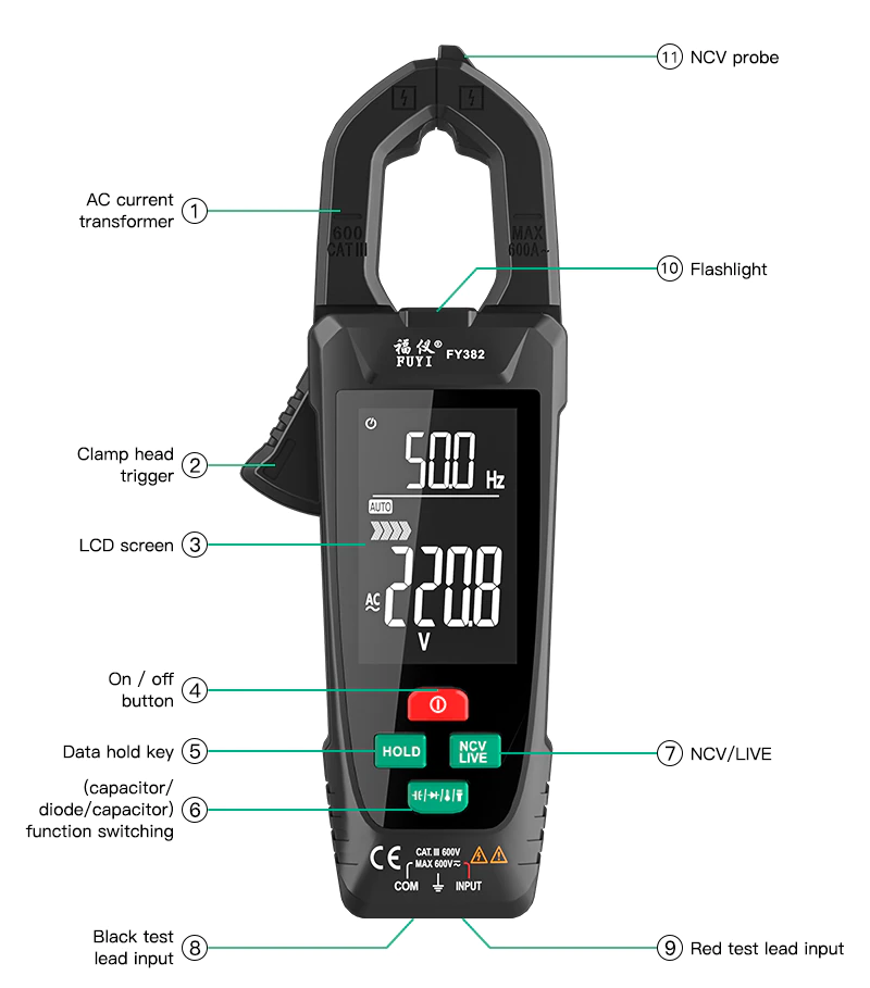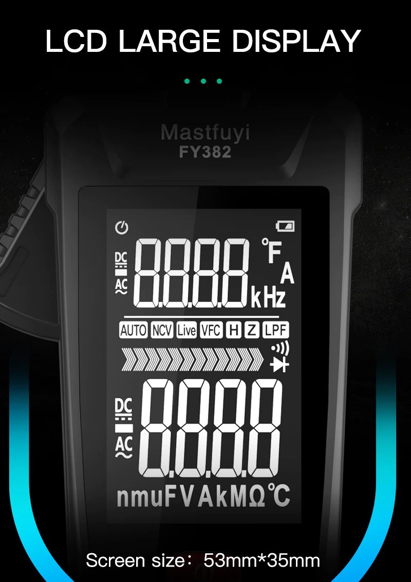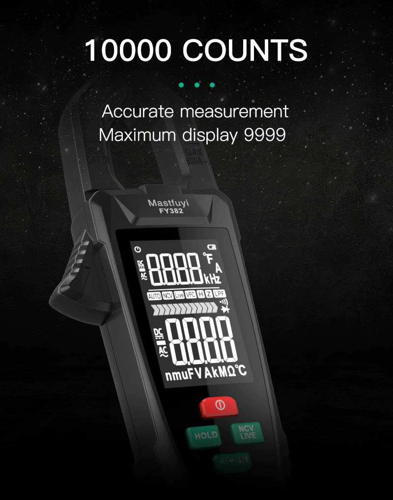 FY382 빅 스크린 디지털 클램프 미터 스마트 플라이어 전류계 AC 전류 전압 멀티 미터 True RMS 온도 커패시턴스 NCV 라이브 테스트