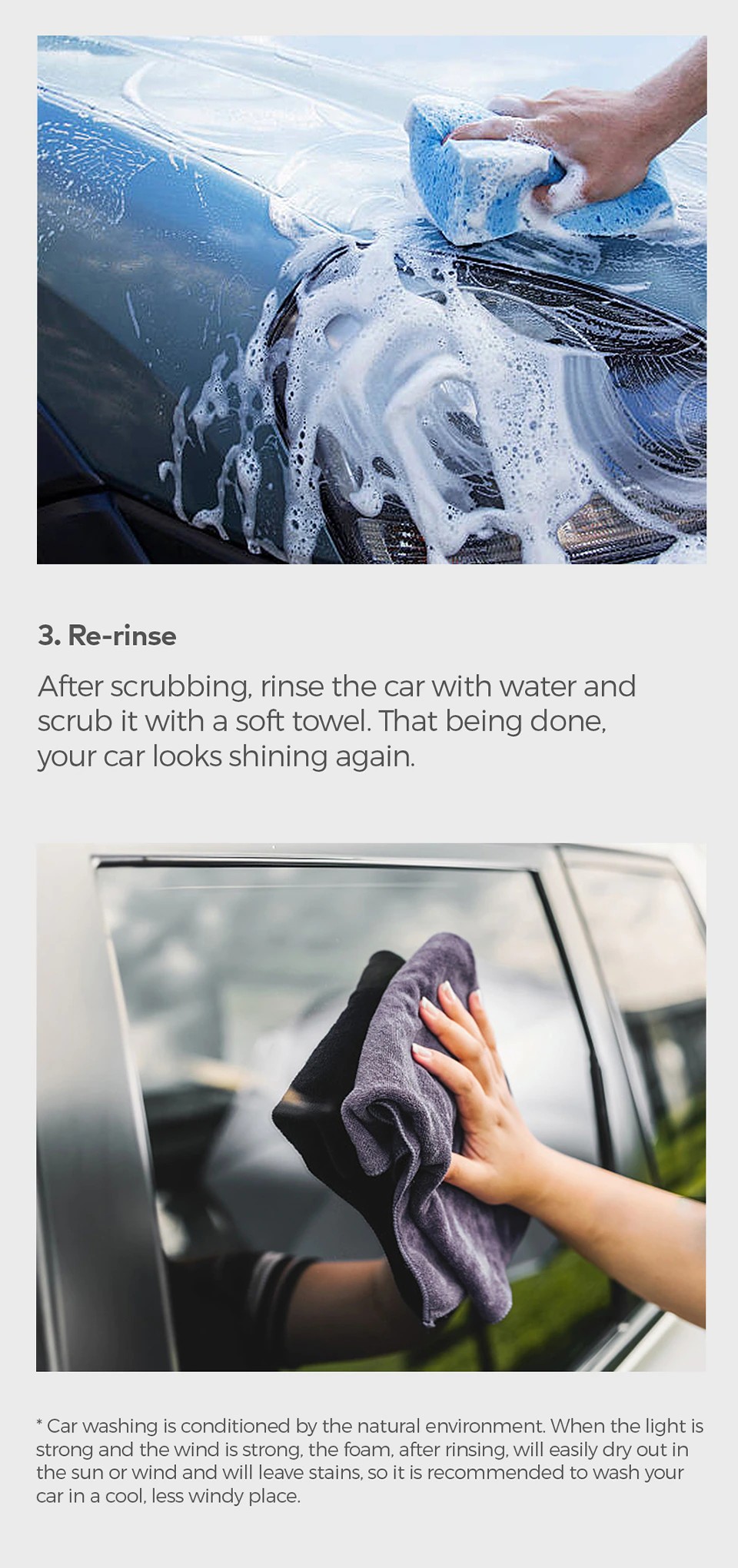 샴푸 용기를 사용하여 차 전체에 거품을 뿌리고 문지릅니다.