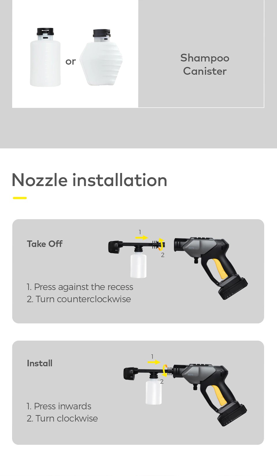 6-in-1 노즐, 충전기, 전원 어댑터, 물 호스, 샴푸 캐니스터