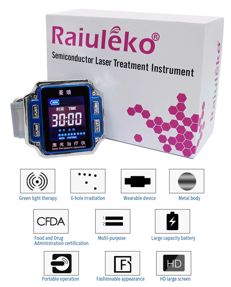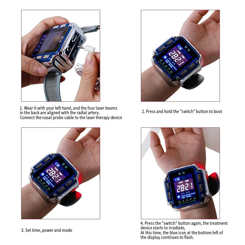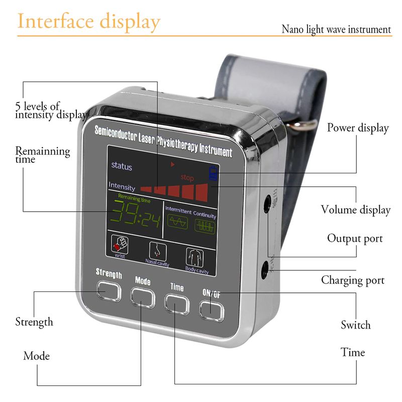 다음 조건은 엄격히 금지됩니다. 임신, 암, 출혈 질병. 급성 심근 경색을 겪는 사람은, 출혈 경향이있는 질병이나 질병이 당뇨병 손목 시계를 사용하는 것이 금지되어 있습니다. 레이저가 발광될 때 동공 지역에서 레이저를 멀리 유지하십시오.