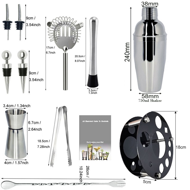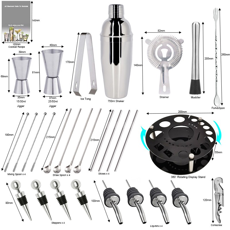 1x750ml 칵테일 셰이커, 1 x 아크릴 회전 원형 스탠드, 1x15/30ml, 1x25/50ml, 4 x 거꾸로 된 스토퍼, 1 x 머들러, 1 x 아이스 집게, 1 x 바 스푼, 1 x 코르크 스크류, 1 x 캔 오프너, 1 x 칵테일 레시피, 1 x 스트레이너.