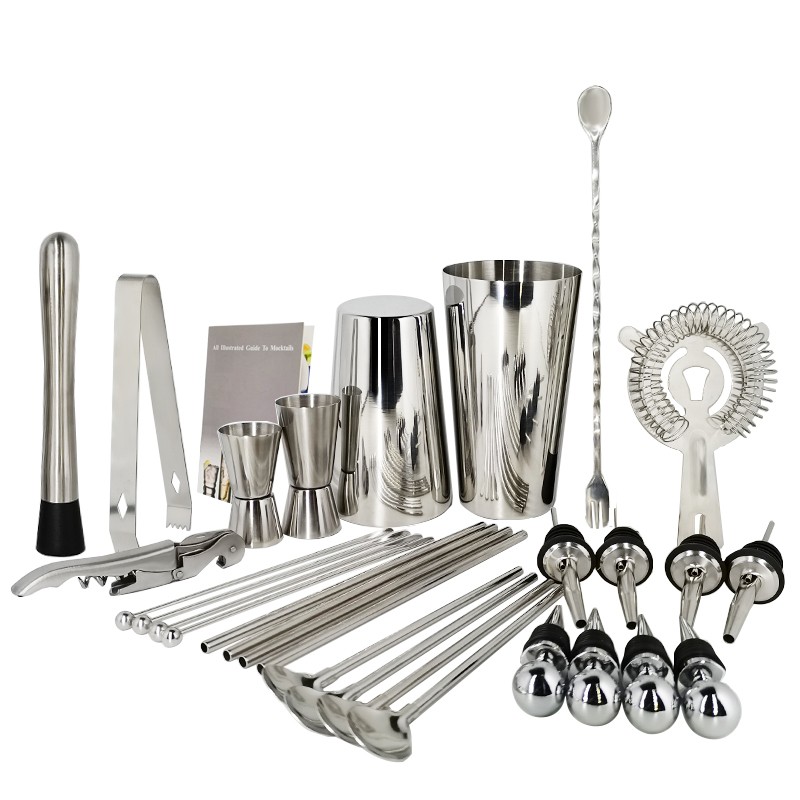 1x750ml 칵테일 셰이커, 1x15/30ml, 1x25/50ml, 4 x 거꾸로 된 스토퍼, 4 x 원형 와인 스토퍼, 4 x 빨대, 4 x 빨대 스푼, 4 x 스터링 막대, 1 x 머들러, 1 x 아이스 집게, 1 x 바 스푼, 코르크 스크류 1 개, 칵테일 레시피 1 개, 스트레이너 1 개