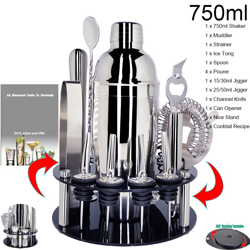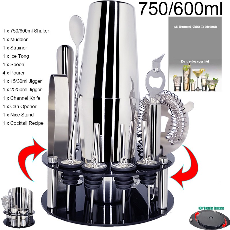 1x750ml 칵테일 셰이커, 아크릴 회전 원형 스탠드 1 개, 15/30ml 1 개, 거꾸로 된 스토퍼 2 개, 원형 와인 스토퍼 2 개, 머들러 1 개, 1 x 아이스 집게, 1 x 바 스푼, 1 x 칵테일 레시피, 1 x 스트레이너.