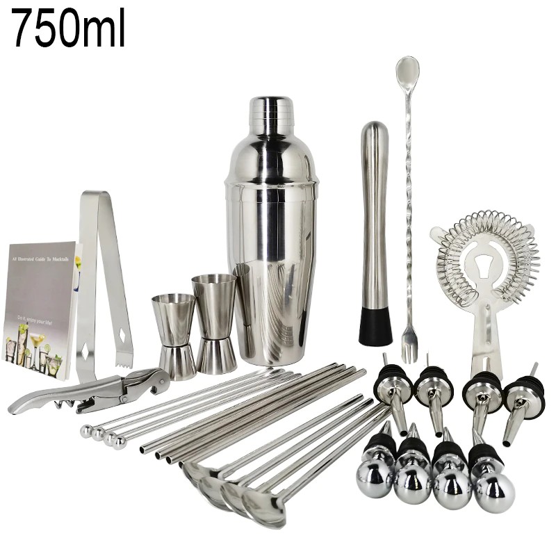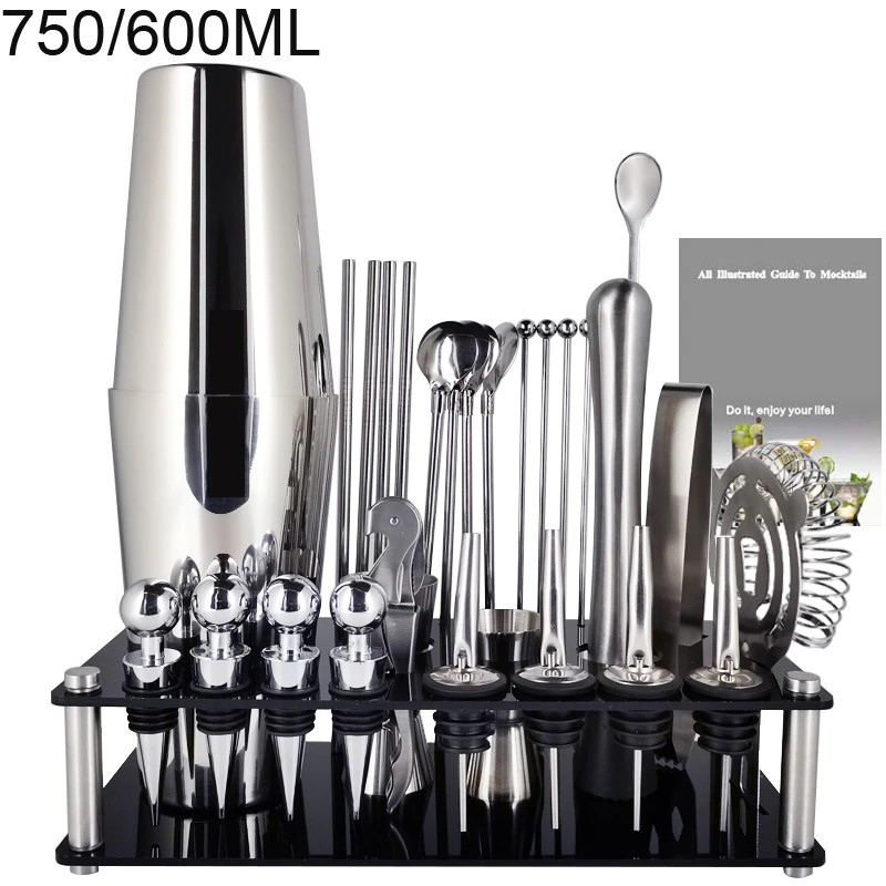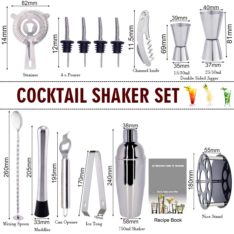 1x750ml 칵테일 셰이커, 1 x 아크릴 스탠드, 1x15/30ml, 1x25/50ml, 4 x 거꾸로 된 스토퍼, 1 x 머들러, 1 x 아이스 집게, 바 스푼 1 개, 코르크 스크류 1 개, 캔 따개 1 개, 칵테일 레시피 1 개, 스트레이너 1 개.