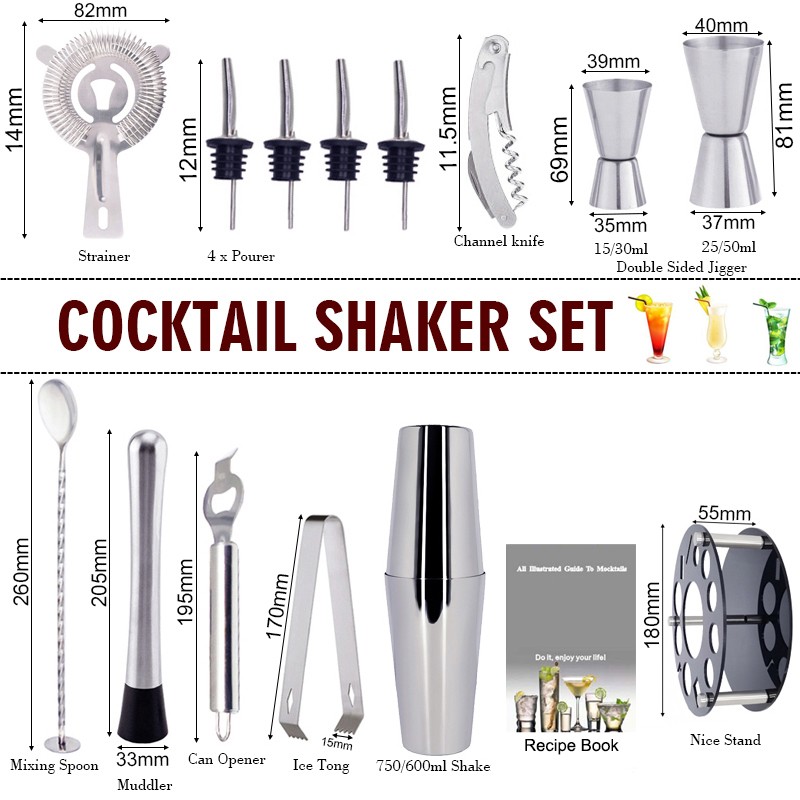 1x750/600ml 칵테일 셰이커, 1 x 아크릴 스탠드, 1x15/30ml, 1x25/50ml, 4 x 거꾸로 된 스토퍼, 1 x 머들러, 1 x 아이스 집게, 1 x 바 스푼, 1 x 코르크 스크류, 1 x 캔 오프너, 1 x 칵테일 레시피, 1 x 스트레이너.