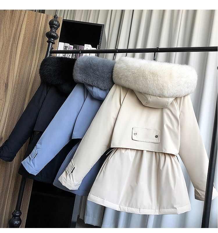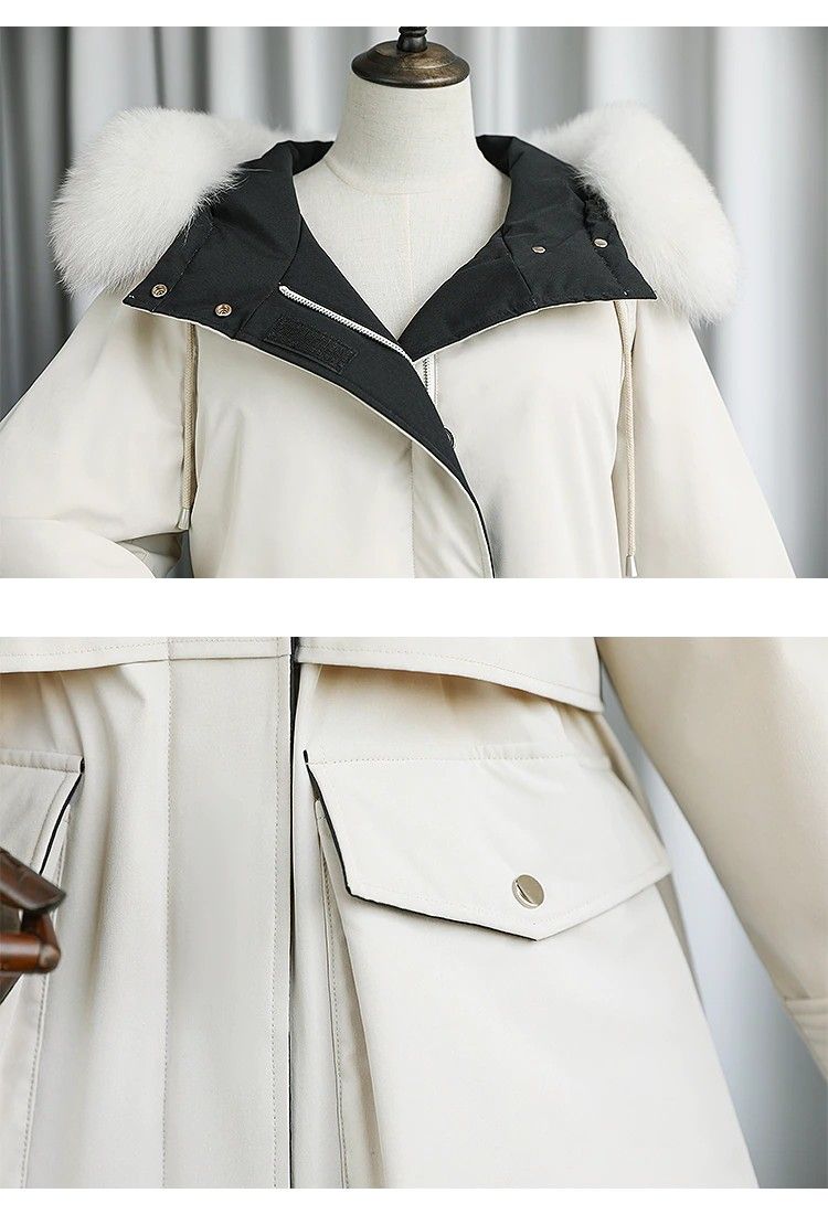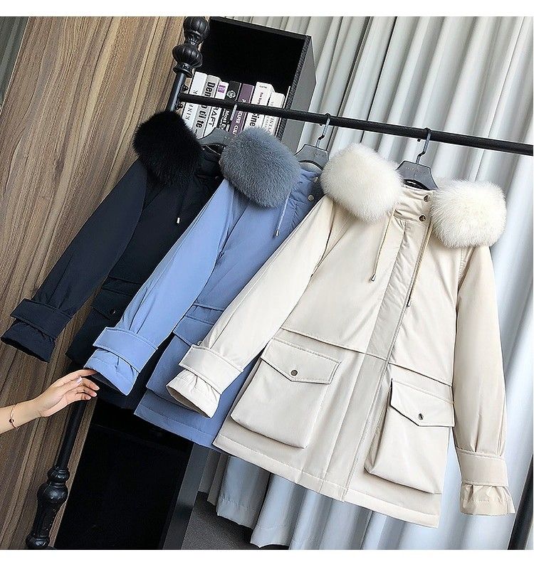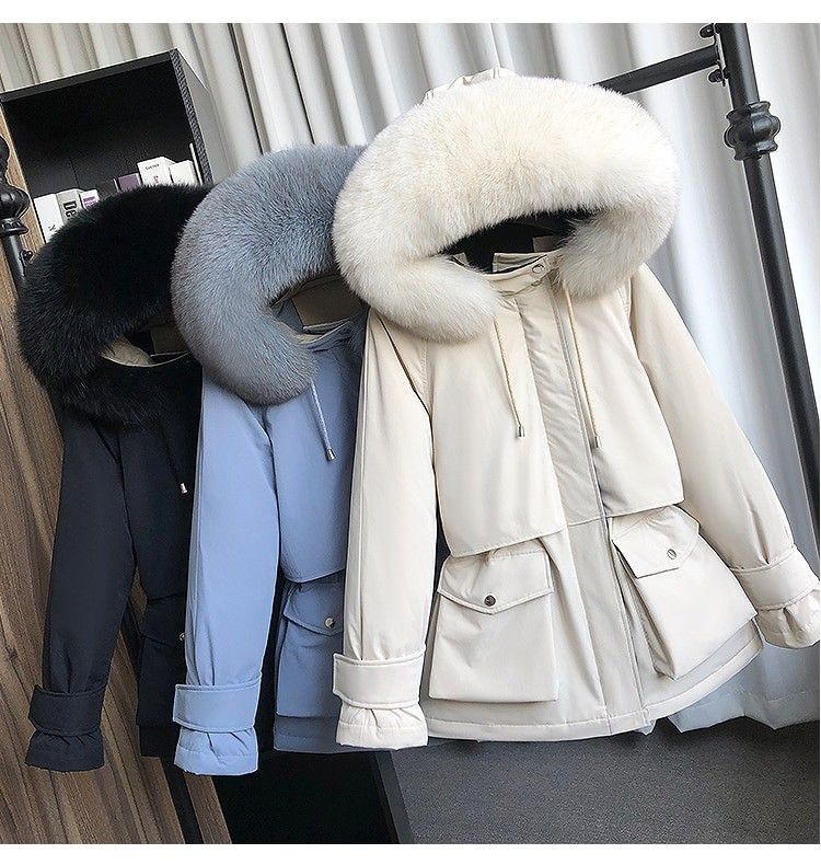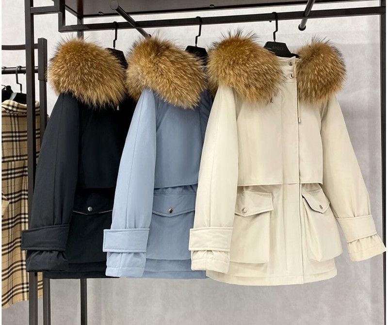 겨울 재킷 여성 모피 칼라 코트 : 겨울 자켓 여성 파카 너구리, 화이트 오리 다운 재킷