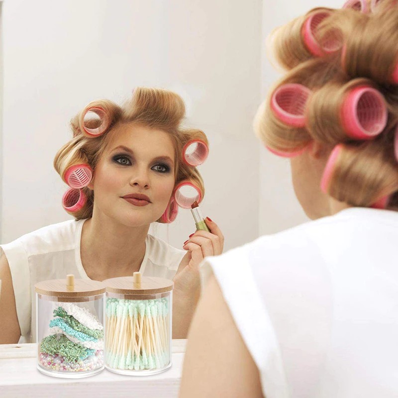 메이크업 목화 패드 주최자 대나무 뚜껑 면봉 Qtip 스토리지 박스 투명 주최 화장품 쥬얼리에 대한