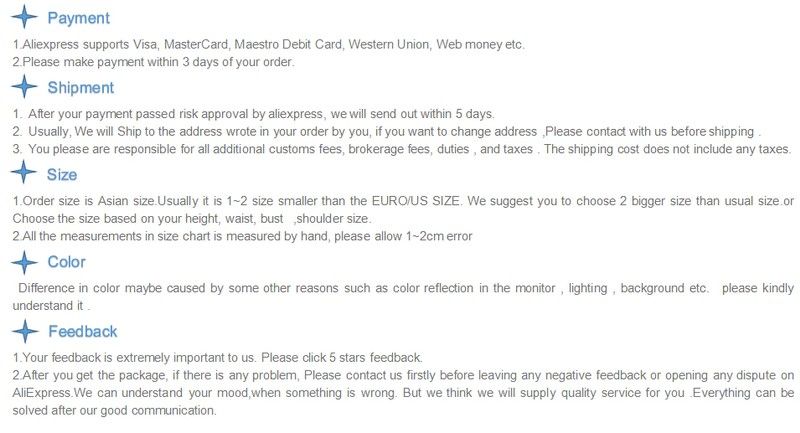 1. 우리의 크기는 미국, 유로 보다는 더 작은 2 크기인 아시아 크기입니다. . 우리는 당신이 당신의 보통 크기에 근거를 둔 2 크기를 추가하는 것을 건의합니다. 2. 당신의 정상적인 셔츠를 측정하고, 흉상, 허리, 어깨, 우리의 크기 도표와 소매를 비교하십시오. 선택하십시오. 당신이 확실하지 않은 경우에, 저희 접촉하고 당신의 고도 및 무게를 저희에게 말하기 위하여 messsage를 남겨두십시오, 우리는 당신을 빨리 대답할 것입니다.