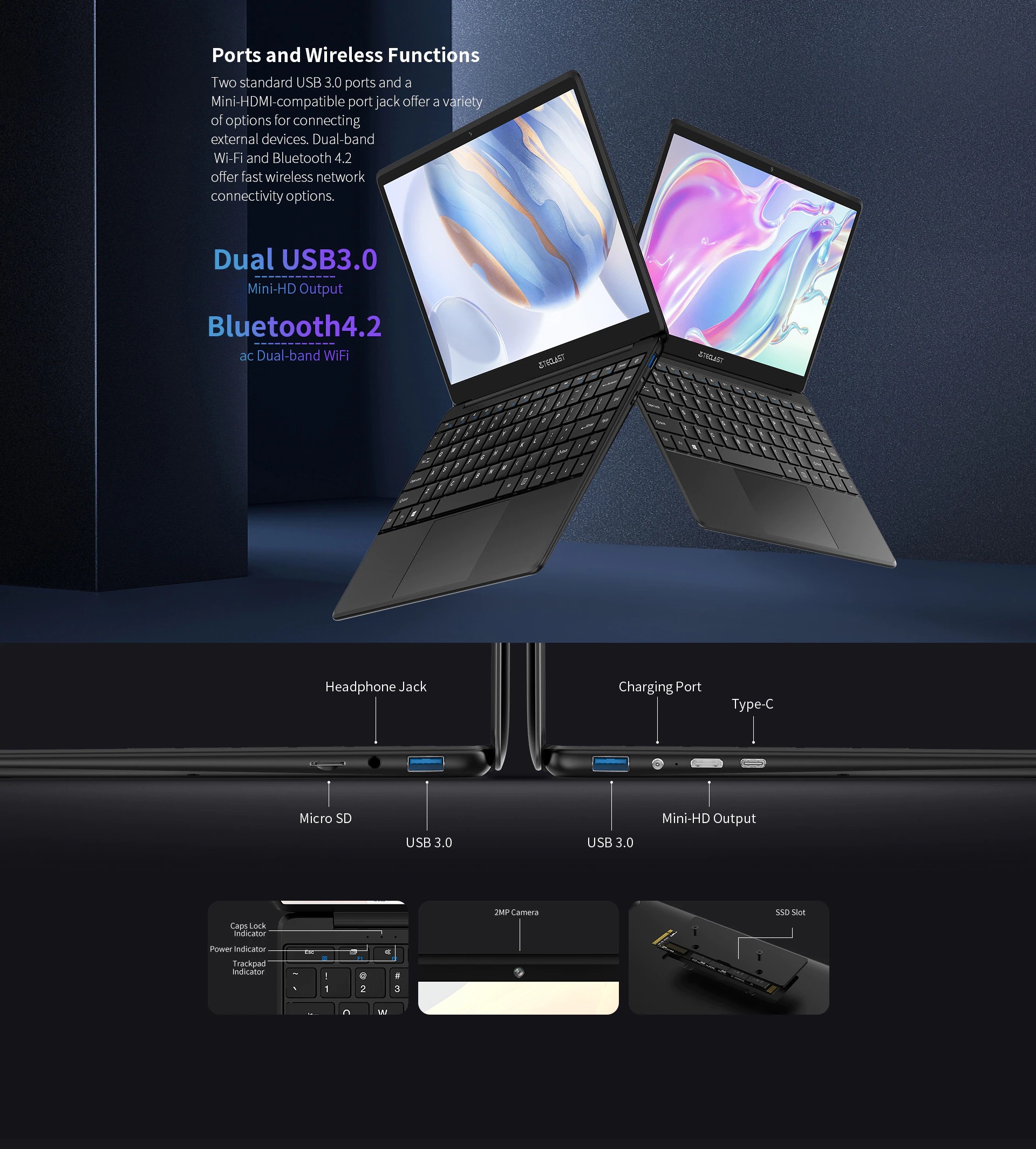 2개의 표준 USB 3.0 항구 및 소형 HDMI 호환성 항구 잭은 외부 장치 연결을 위한 다양한 선택권을 제안합니다. 듀얼 밴드 와이파이 및 블루투스 4.2 빠른 무선 네트워크 연결 옵션을 제공합니다.