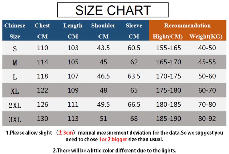 1. 자료를 위한 경미한 (± 3cm) 수동 측정 편차를 허용하십시오. 왜냐하면 중국 크기 그래서 우리는 당신이 보통 보다는 1or2 더 큰 크기를 선택해야 하는 건의합니다.